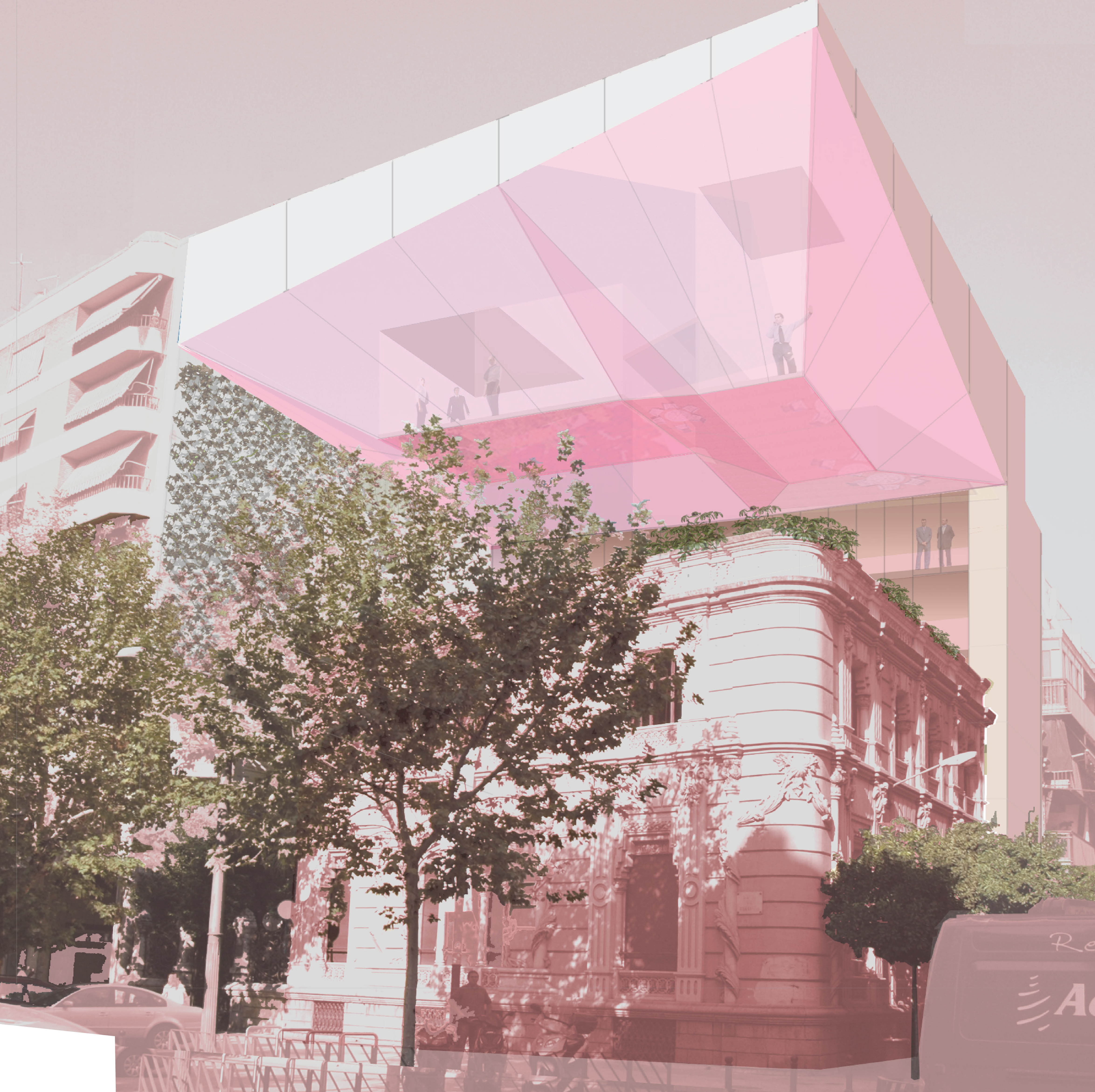 1. Consolidación Urbana. Ampliar hasta conseguir la densidad y escala de la fábrica existente. Para ello, el edificio construye una gran visera habitable sobre el edificio original, adquiriendo el volumen general de edificación de la avenida del Gran Capitán. Esta ampliación física considera no solo el volumen edificado, sino también una ampliación del jardín, que se extiende saltando sobre la cubierta del edificio existente. Con esta primera ampliación física el edificio queda integrado formalmente en la ciudad.