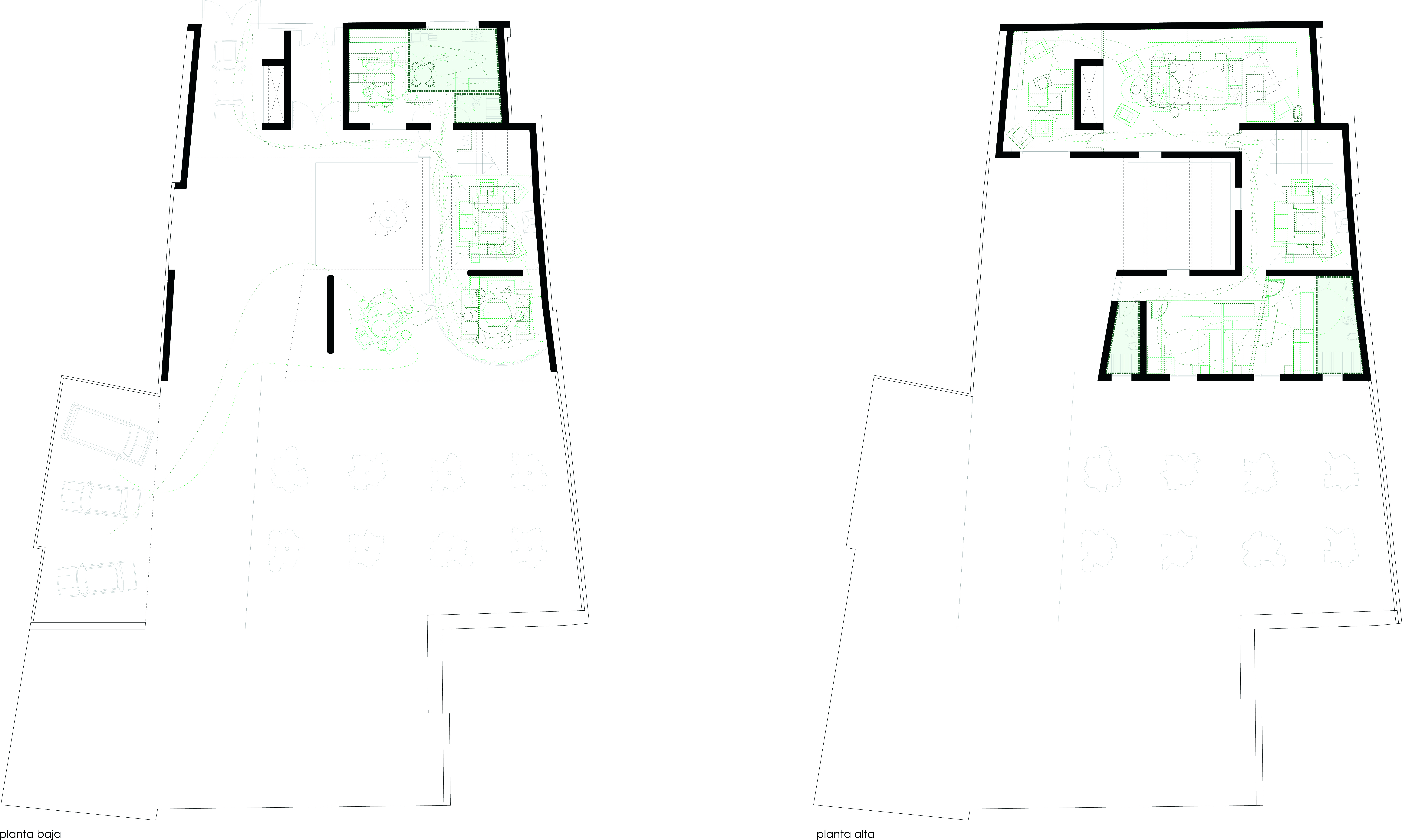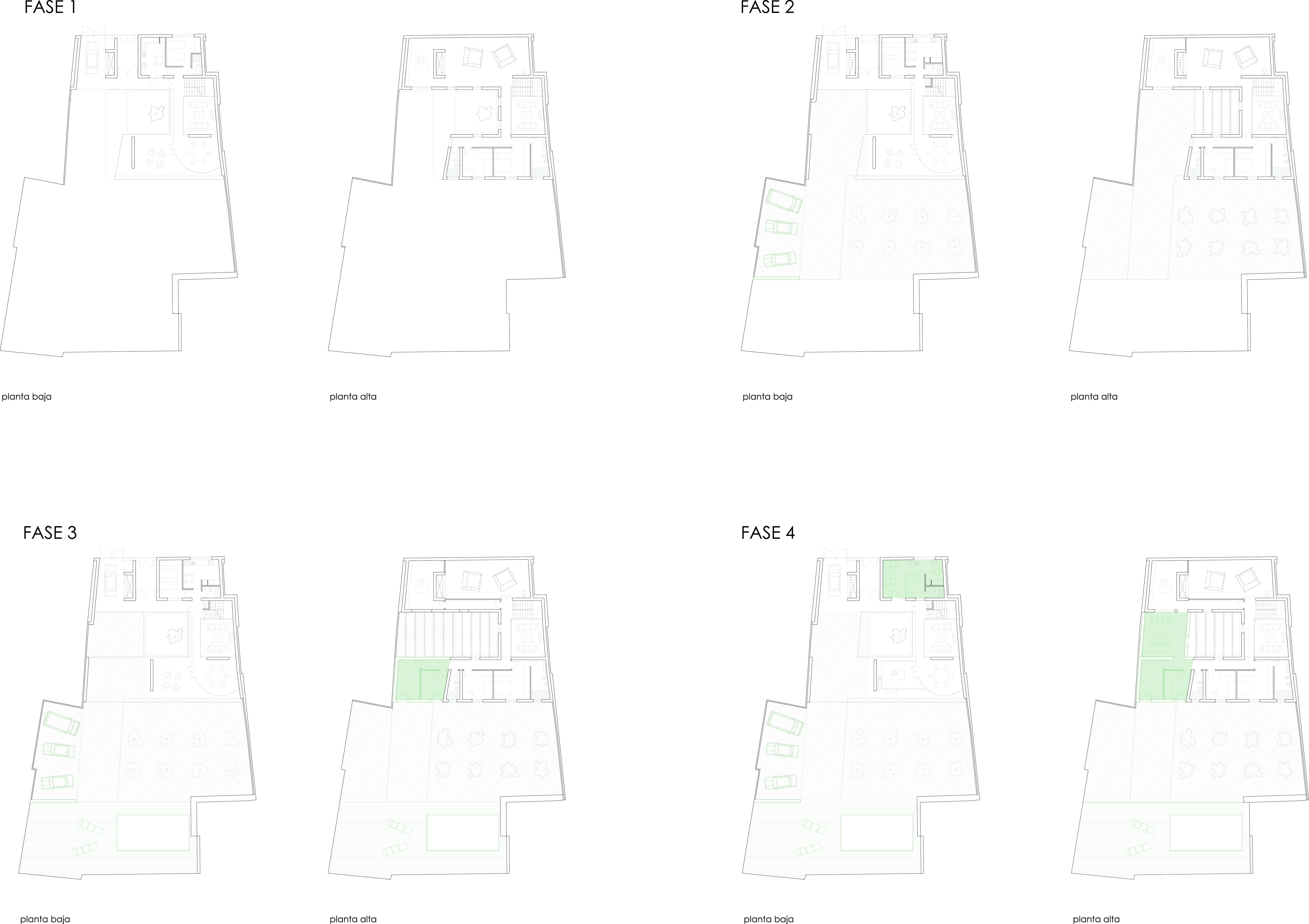 Bajo estas premisas, lo primero que se construirá será el primer piso para dar forma al patio. La construcción de este piso superior también resuelve los problemas estructurales y de impermeabilización con relación al suelo, los más importantes de la vivienda. Mientras la planta baja, que incluye cocina y sala de estar, está casi abierta al patio.