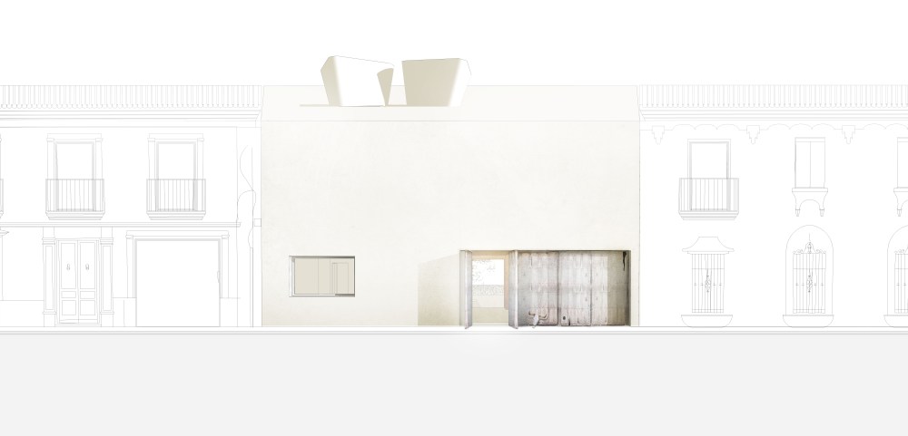 La fachada de la casa también es un ejercicio de trabajo con la arquitectura contemporánea dentro de un pequeño pueblo rural, rehaciendo la presencia simbólica del pintor con tragaluces que salen de la fachada inclinada.