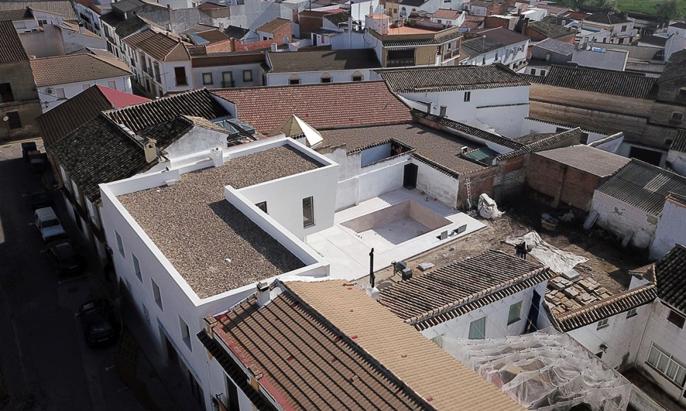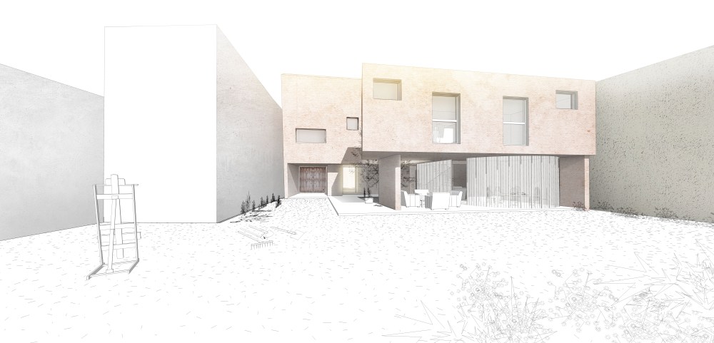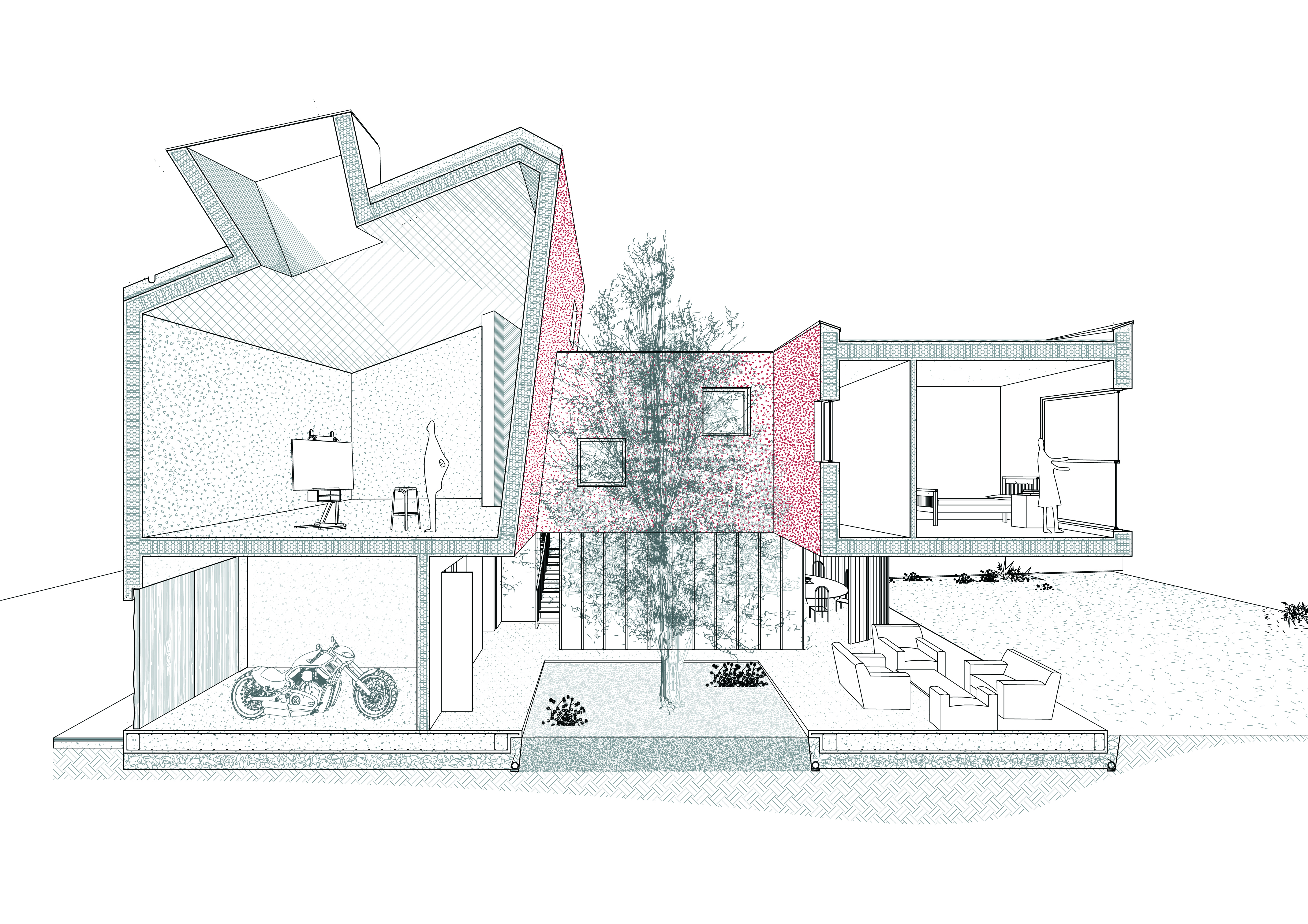 Buscando un sistema de construcción barato capaz de crear una primera carcasa espacial para ser ocupada y luego expandirla, se empleará un sistema de muros de soporte hechos de paneles aislantes sobre los que se proyectarán hormigón. Este caparazón espacial creará una base estructural duradera de alto rendimiento energético alrededor del cual la casa crecerá hacia adentro y hacia afuera. Además, según lo solicitado por el cliente, el patio está expuesto a la calle sin exponer nada de la casa, dando un cierto sentido de falsa transparencia irónica e intencionada.