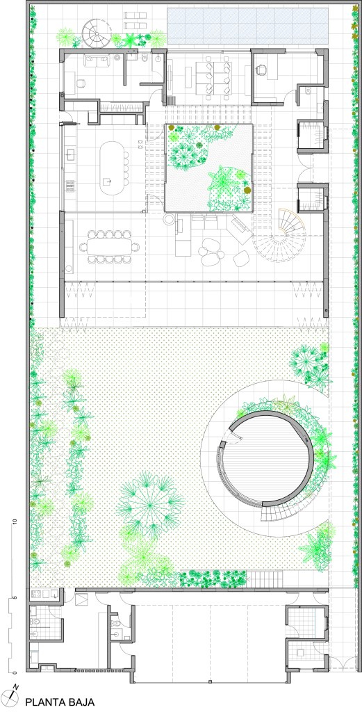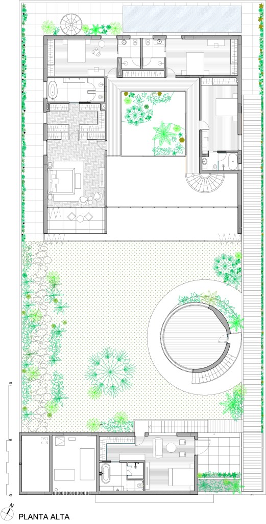 Furthermore, the courtyard is freed from structural responsibilities thanks to a cantilevered construction along the perimeter, where the surrounding corridor projects outward and central supports are eliminated. This perforated corridor allows light to pass through, creating a gradual transition toward the interior and giving the courtyard a lighter presence. Thus, far from being a monolithic element, the courtyard becomes a space of light and vegetation—ambiguous and elusive.
